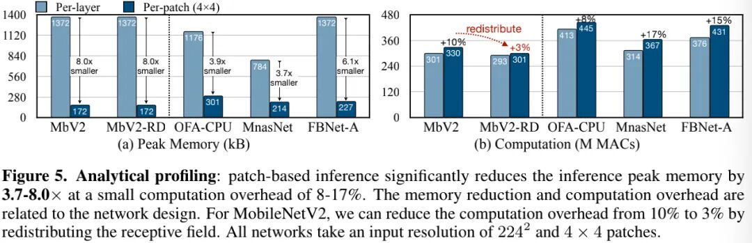 上图给出了on-device profiling的结果,它不仅与架构相关还与硬件相关。可以看到:patch推理可以降低SRAM峰值内存达4-6x 。某些模型可能会因初始阶段的低硬件利用导致更长的推理延迟,但合理的架构设计可以将额外推理延迟降低到4%,相比内存降低完全可以忽略。
