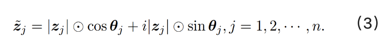 其中 i 是满足 i^2 = -1 的虚数单位,|·| 表示绝对值运算,⊙是逐元素乘法。幅值 |z_j| 是实值的特征,表示每个 Token 所包含的内容。θ_j 表示相位,即 Token 在一个波周期内的当前位置。