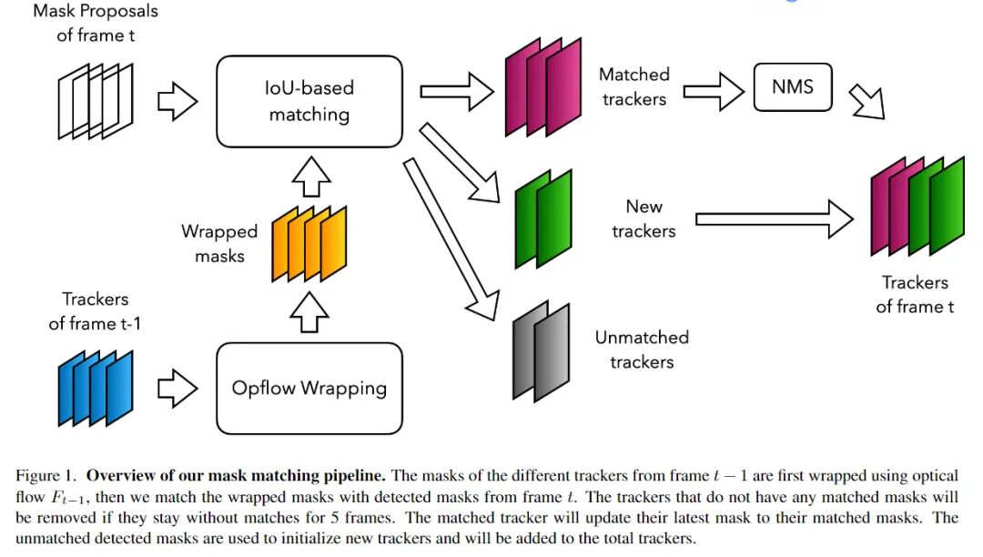 图1显示了本文方法的概述。作者的想法类似于IoU-tracker。利用预测的光流将前一帧的跟踪器wrapped 到当前帧,然后通过计算被wrapped Mask与detected Mask之间的IoU将跟踪器与当前帧的detected Mask匹配。用M表示所有帧的 mask proposals,表示帧t的mask proposal。t表示视频长度,F表示光流,其中表示帧t与帧t+1之间的光流。