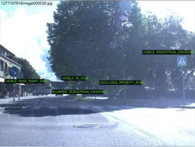 通过记录超过 350 公里的瑞典高速公路和城市道路的序列,创建了一个数据集。一个 1.3 兆像素的彩色摄像机,一个点灰色变色龙,被放置在一辆汽车的仪表板上,从前窗向外看。摄像头略微指向右侧,以便尽可能多地覆盖相关标志。该镜头的焦距为 6.5 毫米,视野约为 41 度。高速公路上的典型速度标志大约为 90 cm 宽,如果要在大约 30 m 的距离处检测到它们,则对应于大约 50 像素的大小。总共记录了超过 20 000 帧,其中每五帧被手动标记。每个标志的标签包含标志类型(人行横道、指定车道右侧、禁止站立或停车、优先道路、让路、50 公里/小时或 30 公里/小时)、能见度状态(遮挡、模糊或可见)和道路状态(是否标志是在正在行驶的道路上或在小路上)。