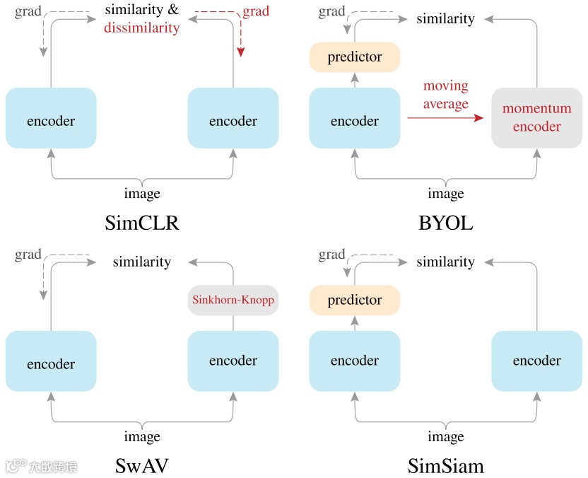 从数学公式上看,InfoNCE的alignment和uniformity两部分理论上来说是缺一不可的。如果只有uniformity,没有alignment,那么模型没有聚类的能力;如何只有alignment,没有uniformity,那么容易使得模型将所有的输入输出相同表示,也就是形成退化解。最近一些主流的Self-Supervised方法对于如何避免形成退化解进行了大量的探索,以下主要介绍一下SimCLR/BYOL/SwAV/SimSiam四种SSL算法是如何避免形成退化解的。(ps:示意图源自SimSiam)