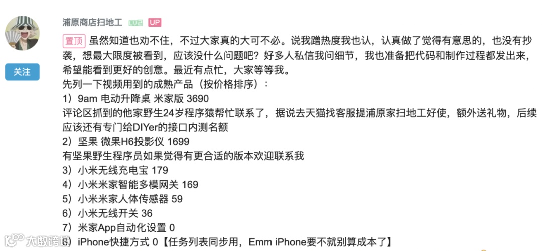 没错,up就是采用了这个方案:59元的人体传感器(视频字幕有误),3690元的远程控制升降桌,还有36元的无线开关。
