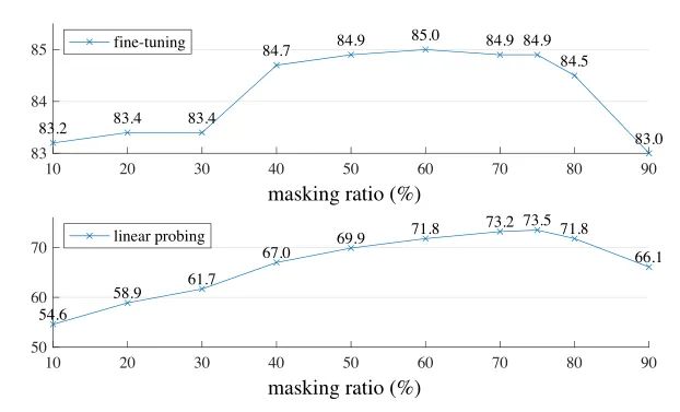 图7还显示了linear probing 和 fine-tuning 的结果随着的不同的变化趋势。对于 fine-tuning,结果是40-80%的 masking ratio 都能 work well。