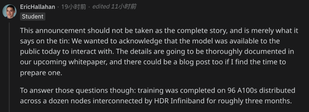 2021 年 1 月,EleutherAI 宣布与 CoreWeave 达成合作,CoreWeave 承诺为 GPT-NeoX-20B 模型训练提供 GPU 资源。研究者透露,他们在 96 个 A100 上完成了 GPT-NeoX-20B 的训练,这些 A100 分布在由 HDR Infiniband 互连的十几个节点上,训练时间持续了大约三个月。