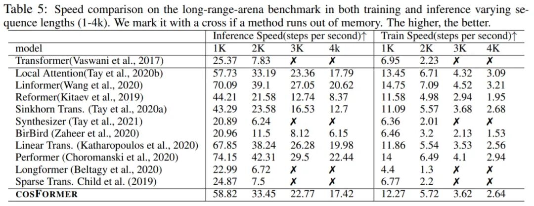 如表 5 和图 1 所示,大多数基于模式、vanilla transformer 的方法都比 COSFORMER 更慢并且需要更大的内存。COSFORMER 在保持卓越建模和泛化能力的同时,总体上比其他线性变体实现了更好的效率。