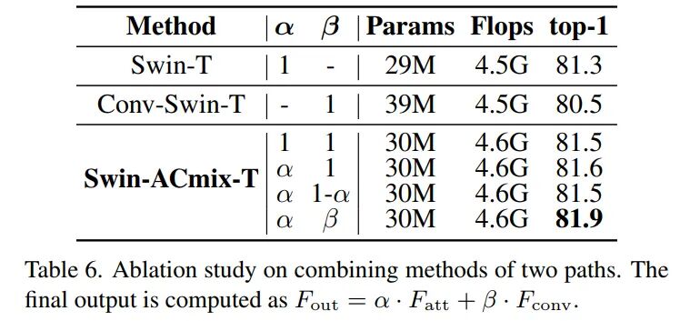 探索卷积和自注意力输出的不同组合对于模型性能的影响。作者采用了多种组合方法进行实验,结果总结如表6所示。通过用传统的3 × 3卷积代替窗口注意,还展示了仅采用一条路径的模型的性能,Swin-T用自注意力,而Conv-Swin-T用卷积。正如所观察到的,卷积和自注意力模块的组合始终优于使用单一路径的模型。固定所有操作符的卷积和自注意力的比例也会导致性能下降。相比之下,使用学习的参数给ACmix带来了更高的灵活性,卷积和自注意力路径的强度可以根据滤波器在整个网络中的位置自适应调整。