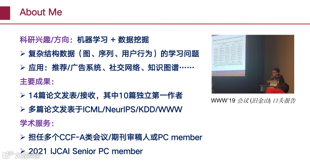 首先和大家介绍一下我的经历,我现在是交大计算机系的博士生,研究方向是机器学习和数据挖掘,主要是关注复杂结构数据的学习问题,应用场景有推荐系统、在线广告、社交网络以及知识图谱等。目前发表了14篇论文,包括10篇独立一作,其中有6篇论文发表在NeurIPS/ICML/KDD三大顶会上。