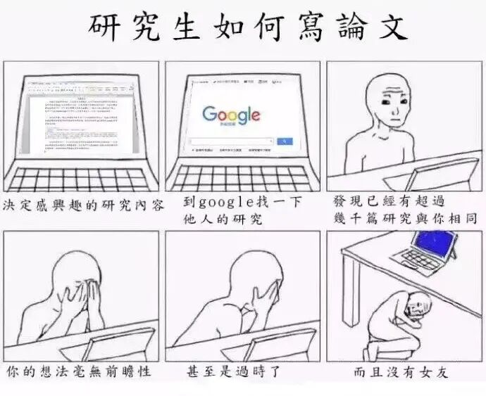 当你想到一个研究问题的时候,你很可能不是第一个想到的。 如果你没找到相关的研究,可能只是因为他人描述问题的形式和你不尽相同,更糟糕的是可能是因为你的问题根本不具备研究价值。无论哪种情况,都是由于文献调研还不够充分导致的。需要多读论文,然后通过交流讨论,确定这个研究问题能不能做下去。不要担心那些和你研究同一个问题的论文:创新性可以来自很多方面,新方法,新结论,新应用点,世界这么大,只要你会讲故事,没那么多论文能和你完全一样(真一样的话就说明是有缘人,发邮件交个朋友去吧)。前人的工作将为你提供很多宝贵的结论、经验、教训,也必然存在不完善的地方,沿着前人的不足做下去就好了。