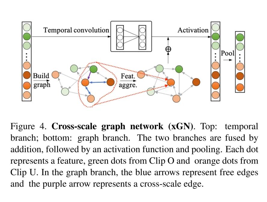 跨尺度图金字塔网络(xGPN)通过一个包含时间分支和图分支的混合模块,在多个网络级别上逐步聚合来自跨尺度以及来自相同尺度的特征,其网络结构如下图所示: