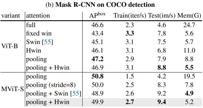 (3)使用池化残差连接,并在所有其他层中添加Q pooled(stride=1),性能得到显著的提升,特别是在COCO(+1.4 APbox)上。这表明在MViT中,Q pooled块和残差路径都是必要的。 -