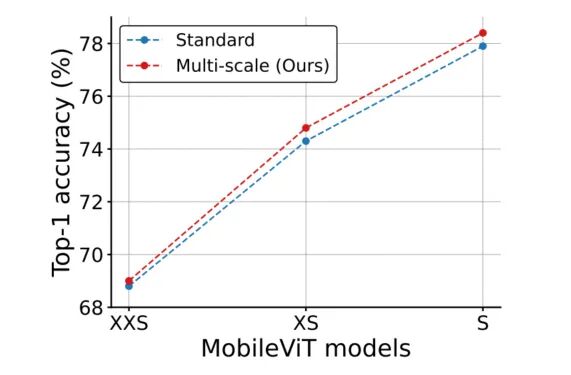 在基于ViT的模型中,学习多尺度表示的标准方法是微调。例如,在不同尺寸上对经过224×224空间分辨率训练的DeiT模型进行了独立微调。由于位置嵌入需要根据输入大小进行插值,而网络的性能受插值方法的影响,因此这种学习多尺度表示的方法对vit更有利。与CNN类似,MobileViT不需要任何位置嵌入,它可以从训练期间的多尺度输入中受益。先前基于CNN的研究表明,多尺度训练是有效的。然而,大多数都是经过固定次数的迭代后获得新的空间分辨率。例如,YOLOv2在每10次迭代时从预定义的集合中采样一个新的空间分辨率,并在训练期间在不同的gpu上使用相同的分辨率。这导致GPU利用率不足和训练速度变慢,因为在所有分辨率中使用相同的批大小(使用预定义集中的最大空间分辨率确定)。