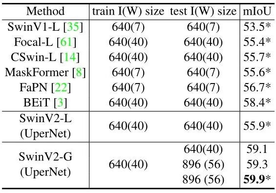 Swin Transformer 提出了一种针对视觉任务的通用的 Transformer 架构,MSRA 进一步打造了一个包含3 billion 个参数,且允许输入分辨率达到1560×1560的大型 Swin Transformer,称之为 SwinV2。它在多个基准数据集 (包含 ImageNet 分类、COCO 检测、ADE20K 语义分割以及Kinetics-400 动作分类) 上取得新记录,分别是 ImageNet 图像分类84.0% Top-1 accuracy,COCO 目标检测63.1/54.4 box / mask mAP,ADE20K 语义分割59.9mIoU,Kinetics-400视频动作识别86.8% Top-1 accuracy。