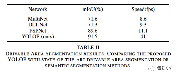 本文将 BDD100K 数据集中的“区域/可行驶”和“区域/替代”类都归为“可行驶区域”,模型只需要区分图像中的可行驶区域和背景。mIoU 用于评估不同模型的分割性能。从结果表II可以看出,YOLOP 分别优于 MultiNet、DLT-Net 和 PSPNet 19.9%、20.2% 和 1.9%,而且推理速度快 4 到 5 倍。可行驶区域分割的可视化结果如图 4 所示。
