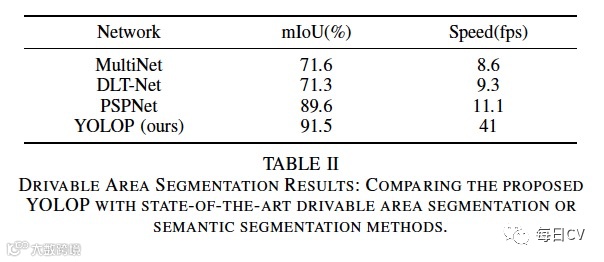MultiNet 和 DLT-Net 都同时处理多个全景驾驶感知任务,并且在 BDD100K 数据集上的目标检测和可行驶区域分割任务中取得了很好的性能,Faster-RCNN 是两阶段目标检测网络的杰出代表,YOLOv5 是在 COCO 数据集上实现最先进性能的单级网络,PSPNet凭借其超强的聚合全局信息能力在语义分割任务上取得了出色的表现。通过在 BDD100k 数据集上重新训练上述网络,与本文在目标检测和可行驶区域分割任务上的网络进行比较。