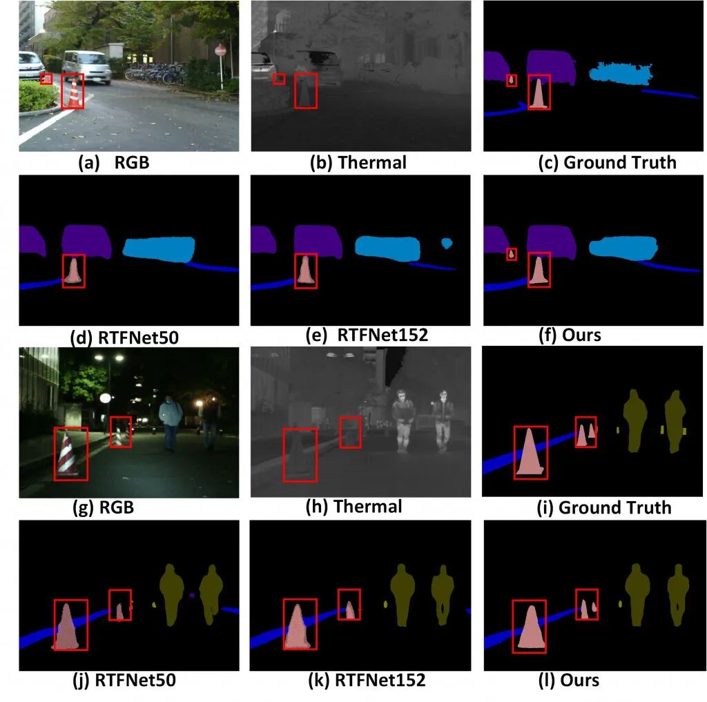 答:在纹理相似、背景暗光,复杂的场景下,RGB图像往往并不能为模型训练提供更多更具有区分度的信息,因此常常会导致预测结果不准确,或者没有办法识别出物体。近年来随着热成像相机的普及,我们发现热红外信息对于照明条件差产生的识别模糊非常有效,例如在城市街景的语义分割任务中就取到了很好的效果,(RGB-T城市街景数据集链接:https://www.mi.t.u-tokyo.ac.jp/static/projects/mil_multispectral/)。因此,可以将热像仪生成的热红外图像作为重要的信息补充。