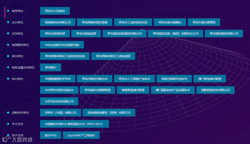 ECV-2021由青岛市人民政府指导,极视角科技有限公司、 青岛市委台港澳办、青岛市工业和信息化局、青岛西海岸新区管委和青岛市城市管理局主办,青岛银行为独家金融支持单位,英特尔(中国)有限公司为战略合作伙伴, 中国模式识别与计算机视觉大会(PRCV 2021)提供学术支持,极市平台、OpenVINO™工具套件提供技术支持,马达智数提供数据支持。