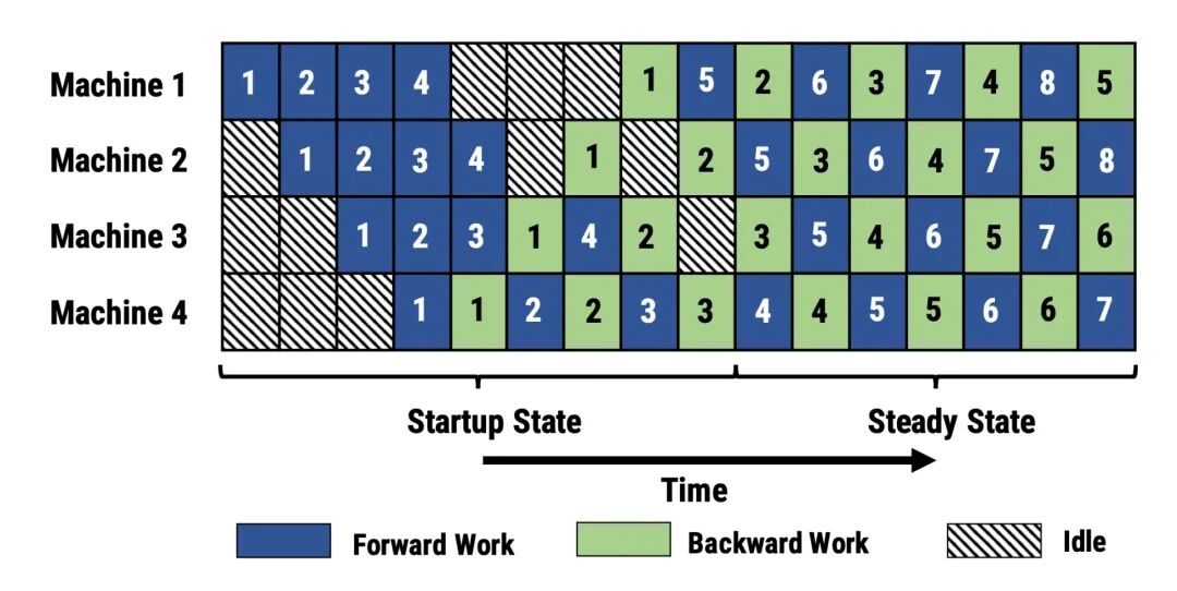 PipeDream(Narayanan等人,2019)用每个worker交替处理向前和向后传递(1F1B)。