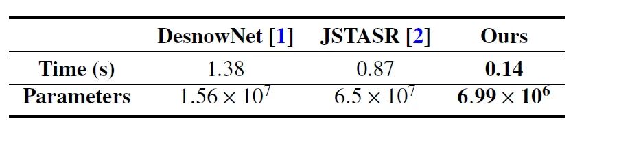 而提出的算法在去雪效果以及计算复杂度也明显优于现有的去雪网络,在单张影像去雪工作又往前进了一步。