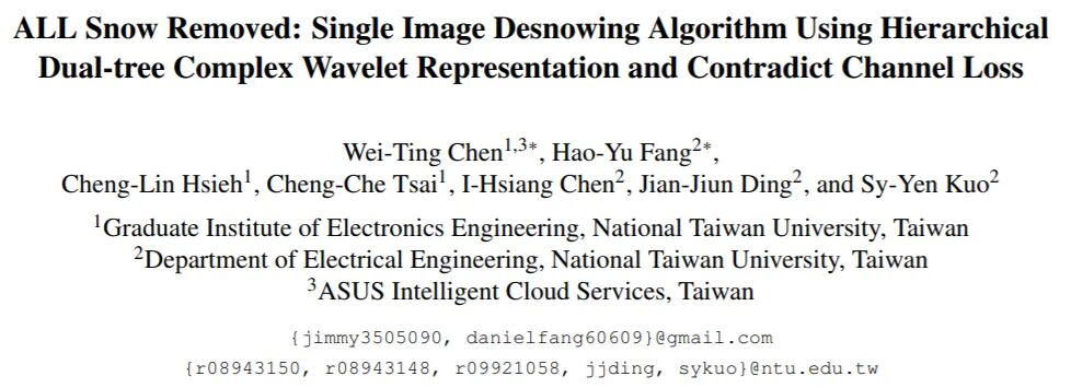 [3] Chen, W. T., Fang, H. Y., Hsieh, C. L., Tsai, C. C., Chen, I., Ding, J. J., & Kuo, S. Y. (2021). ALL Snow Removed: Single Image Desnowing Algorithm Using Hierarchical Dual-Tree Complex Wavelet Representation and Contradict Channel Loss. In Proceedings of the IEEE/CVF International Conference on Computer Vision (pp. 4196-4205).