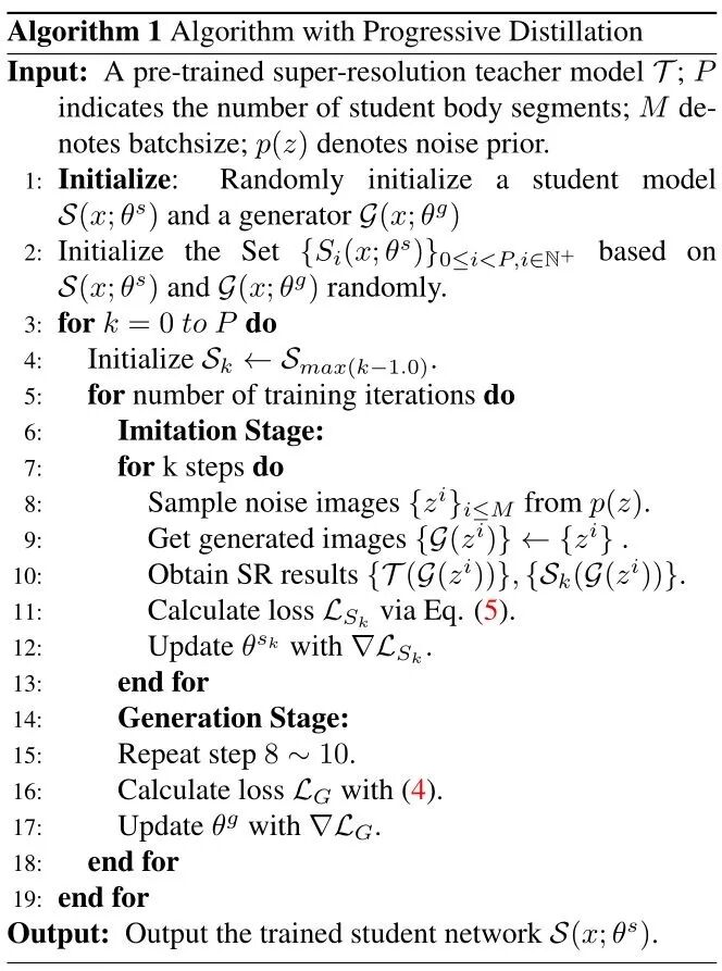 使用生成数据结合蒸馏算法得到压缩后的超分网络 。