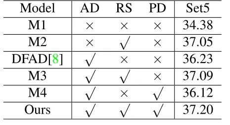 M3表示将对抗损失和重建损失相结合,可以获得显著更好的性能,PSNR达到37.09dB。 -