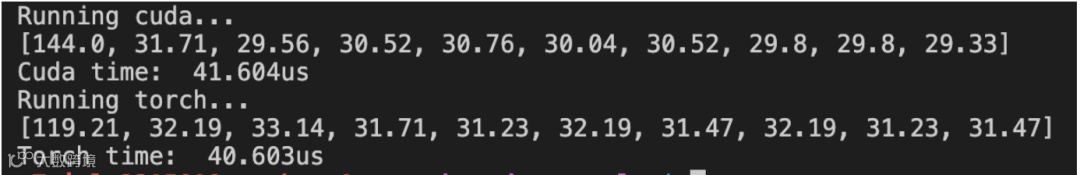 这里我们torch和cuda分别执行10次看看平均时间,此外执行前需要先执行10次做一下warm up,让GPU达到正常状态。