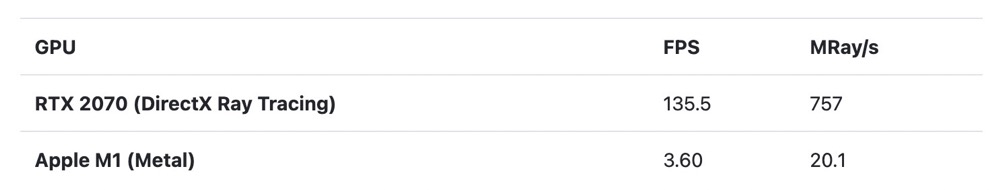 所以一位从事光线追踪 (Ray tracing)技术的程序员,就对M1产生了兴趣。