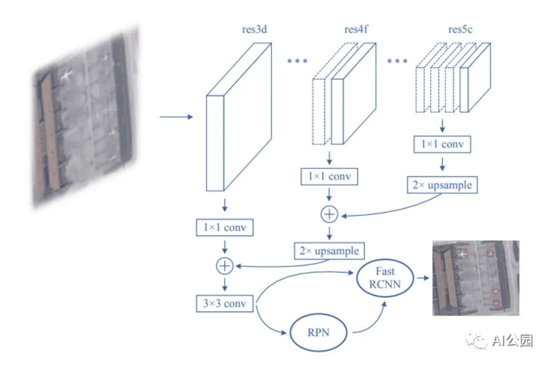 本文作者也使用Faster-RCNN作为主要网络。他们所做的修改与FPN的想法相似 —— 将高层的特征与低层的特征结合起来。但是,他们没有迭代地组合层,而是将它们连接起来,并对结果运行1×1卷积。这在作者提供的体系结构可视化中得到了最好的体现。