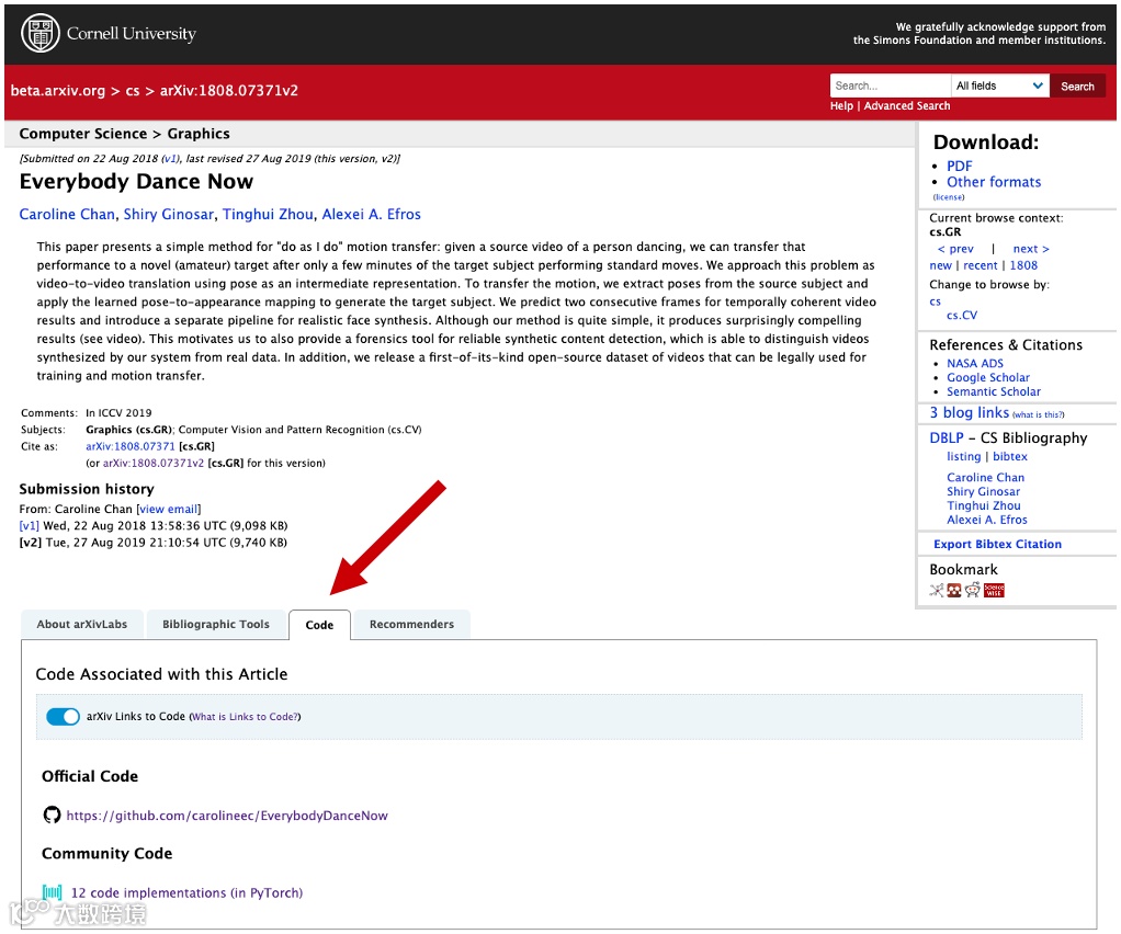 2020 年底,机器学习资源网站 Papers with Code 宣布与论文预印本平台 arXiv 进行合作,论文作者在 arXiv 上上传论文时可以同步上传官方和社区代码。