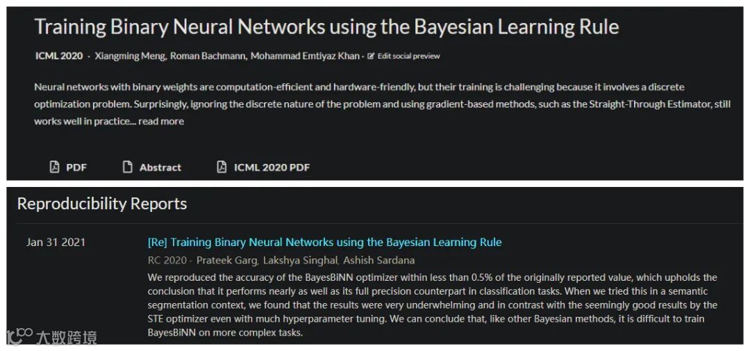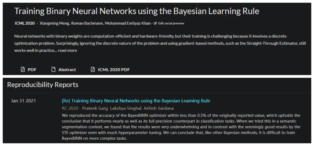 PapersWithCode 以 ICML 2020 论文《Training Binary Neural Networks using the Bayesian Learning Rule》为例展示「论文复现报告」这项新功能。可以看到,PapersWithCode 在论文下方提供了复现报告,包括提交日期和报告摘要。
