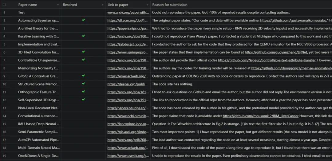 目前,该网站上挂出了 19 篇论文,详细列出了标题、链接、提交原因以及解决与否,可以看到有 8 篇论文显示「已被解决」。