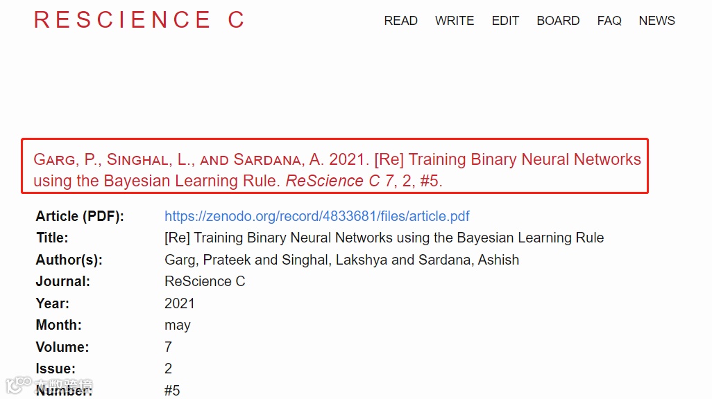 与其他传统科学期刊截然不同,ReScience C 可以说是一个 GitHub 项目,提供了关于计算研究的每个新实现以及评审、解释和测试。PapersWithCode 的示例论文《Training Binary Neural Networks using the Bayesian Learning Rule》就发表在了该期刊上。目前,OpenReview 列出了所有在 RC 2020 挑战赛中被 ReScience C 接收的论文列表。