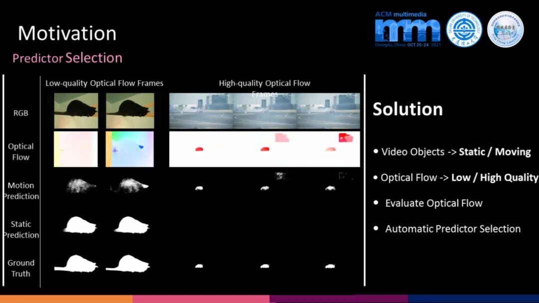 现有的基于光流的方法非常依赖于多个层次上的光流特征与RGB特征的融合。如果,前景(物体)明显偏移,光流图当然可以很好地捕捉物体,这对深度网络是十分有益的。相反,如果背景变化剧烈或前景几乎不移动,则所产生的光流往往具有大量的干扰信息或称之为噪声。如图所示,高质量的光流可以提供有效的引导,而低质量的光流很容易引起干扰。以往基于光流的方法并没有考虑到如何从根本上规避这一问题。我们给出的解决方案是:1.将视频目标分割分为静态显著性与运动目标分割 2.评估光流质量 3.高质量光流对应可靠的运动目标预测结果。从而自动完成动静预测的筛选。