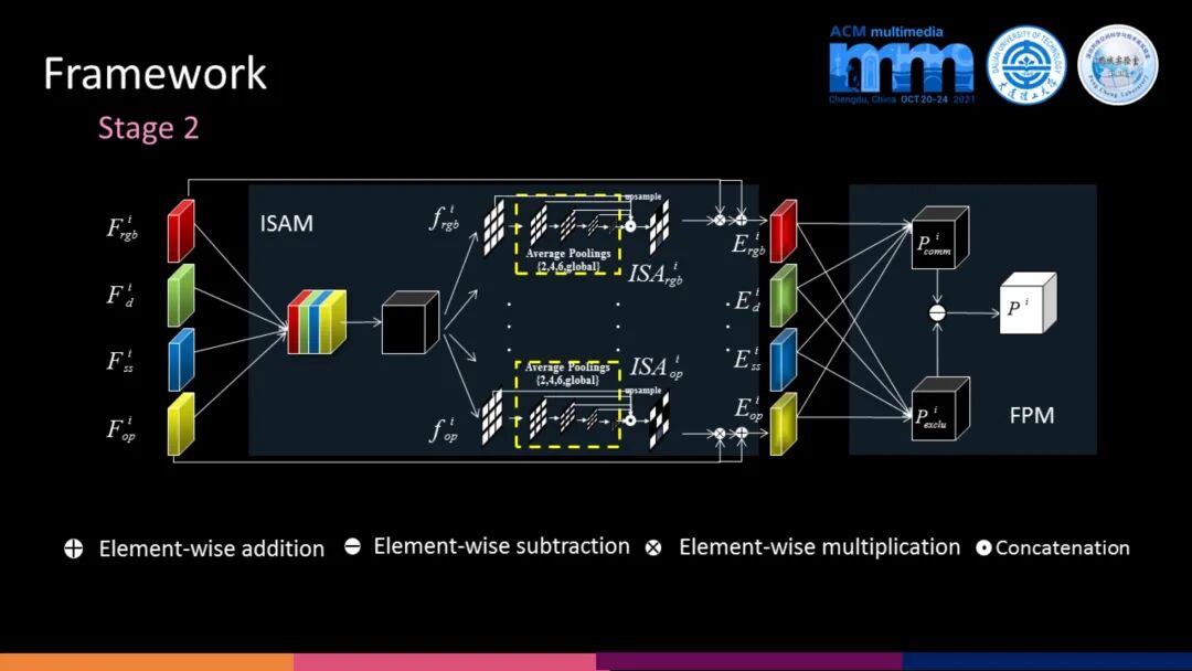 在第二阶段的多源融合网络主要由两个核心模块构成:interoceptive spatial attention module (ISAM)及feature purification module (FPM)。内感空间注意力模块(ISAM)可以自适应地感知每个源特征在其空间位置上的重要性,从而保留融合特征中特定于源的信息。然而,由于源于源之间仍然包含一些天然的相互干扰效应,为此,我们构建了一个特征提纯模块(FPM)来过滤掉不兼容的信息。注意,图中的 和 虽然来源于相同的4种增强特征,但有着不同的卷积参数进行学习和优化。FPM背后的基本原理是,构建的减法范式以及对MOS使用的监督信号将迫使特征 和 分别包含对四源融合的共同的和互斥的信息。在各级 都准备完成后,我们渐进地将它们结合,生成对运动目标的分割预测图。