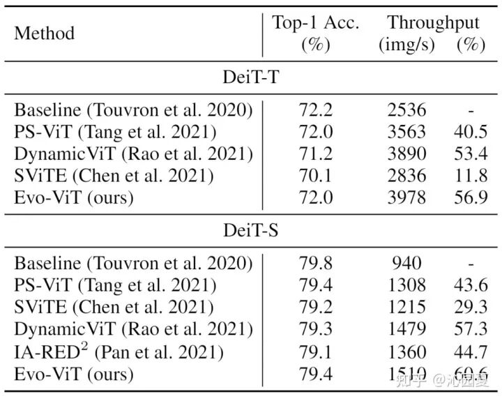 图3是Evo-ViT和现有token相关高效性设计方法的对比,包括PS-ViT[4]、DynamicViT[3]、SViTE[7]、IA-RED2[8]。实验结果表明,其在确保准确率的同时,能够有更高的吞吐量提升,性能优化的表现更佳。