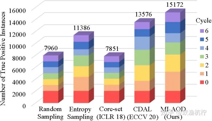 统计分析。 在图 7 中,我们计算了在每个主动学习周期中选择的真实正示例的数量。可以看出,在所有学习周期中,MI-AOD 选用了明显更多的真实正样本。这表明,所提出的 MI-AOD 方法可以在滤除干扰示例的同时更好地激活真实正目标,从而为选择信息量大的图像以供检测器训练提供了便利。