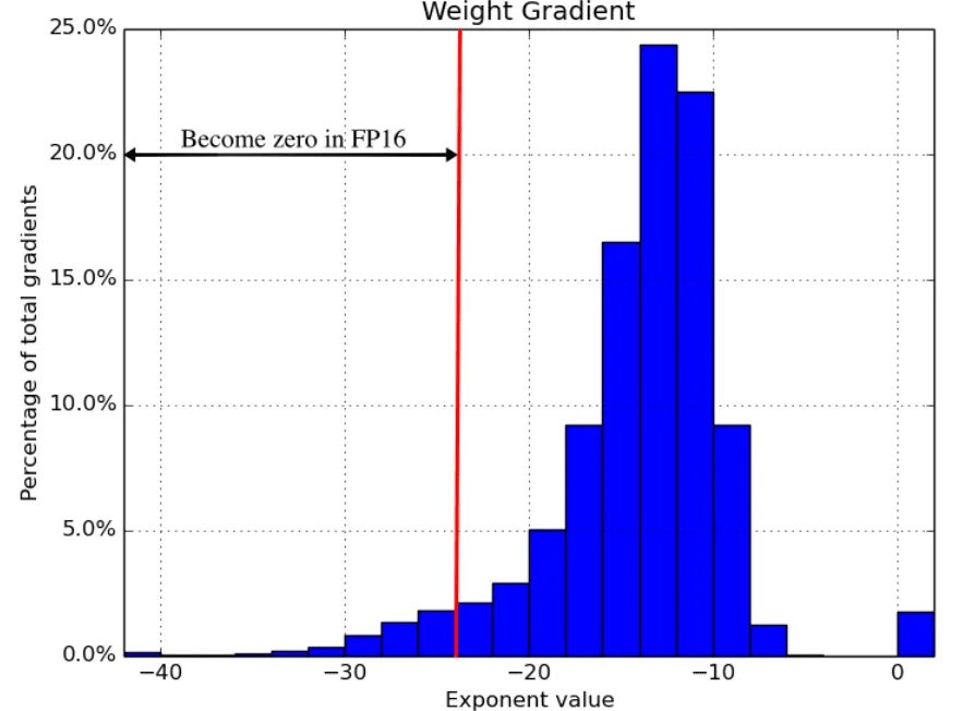 PyTorch中,所有Tensor默认的精度都是FP32,也就是说每一个浮点型参数都需要占用32bit的显存。因此,如果直接把精度降低到FP16,那理论上直接就能减少一半的显存占用。那么,古尔丹,代价是什么呢?代价就是,在反向传播的过程中,大多数更新值都非常小但不为零。反向传播的舍入误差可以把这些数字变成0或者nans,使得梯度更新不准确,影响网络的收敛。ICLR2018论文中Mixed Precision Training[2]发现,使用FP16进行训练的网络约有5%的梯度都会被“吞掉”。