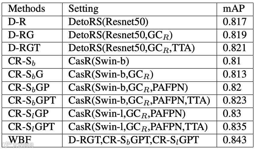 最后,论文用Swin-large、Swin-base、ResNet50等不同的骨架训练Cascade R-CNN和DetectorRS,以获得更好的检测器多样性结果。