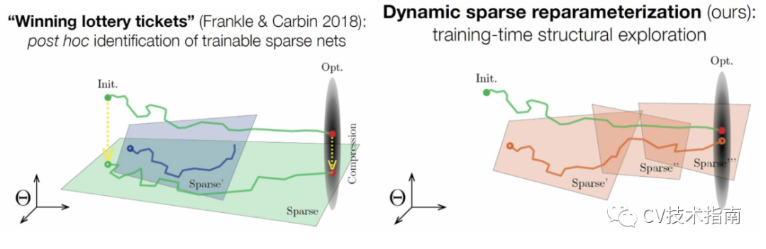Dettmers和Zettlemoyer(2019),Mostafa(2019),和Evci 等人(2019),指明可以从头开始训练适当参数化的稀疏网络,从而大大减少了训练神经网络所需的GPU内存量。重要的不是初始化,而是探索模型的稀疏子空间的能力。Lee等人的类似工作(2018),尝试通过对数据进行一次传递来快速找到合适的稀疏架构。