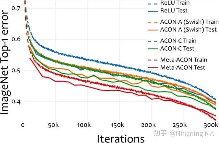 从学习曲线可以看到ACON-C相比于Swish的优势在于后期仍能有提升,Meta-ACON则效果跟为显著