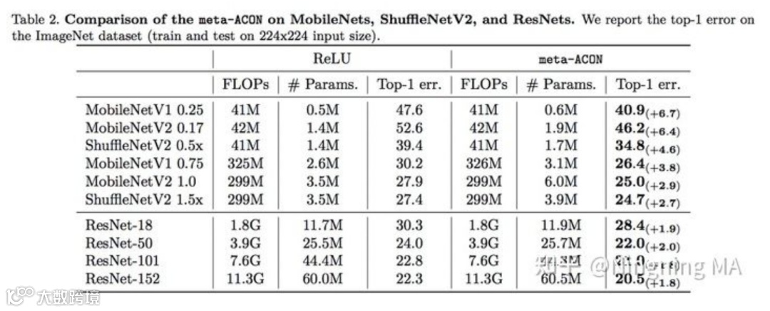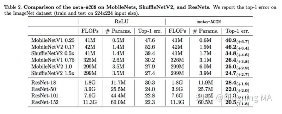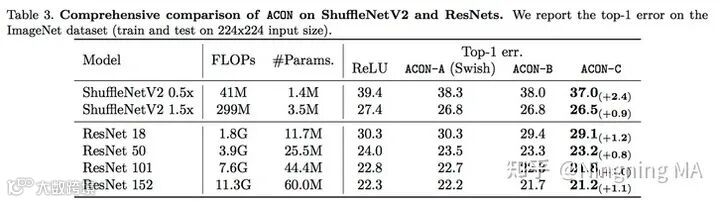 本文在多个任务上验证了此方法的涨点性能和泛化性能(例如在MobileNet-0.25和ResNet-152上,分别将ImageNet准确率提高了6.7%和1.8%),这表明ACON对已有的激活函数中是一种有效的替代方法。