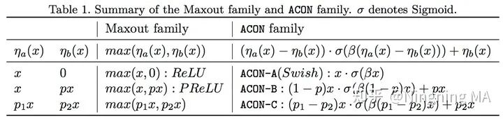 2.本文对 ReLU 的一般式 Maxout 做出同样的平滑近似,便得到了一簇新的激活函数,即 ACON 系列激活函数。