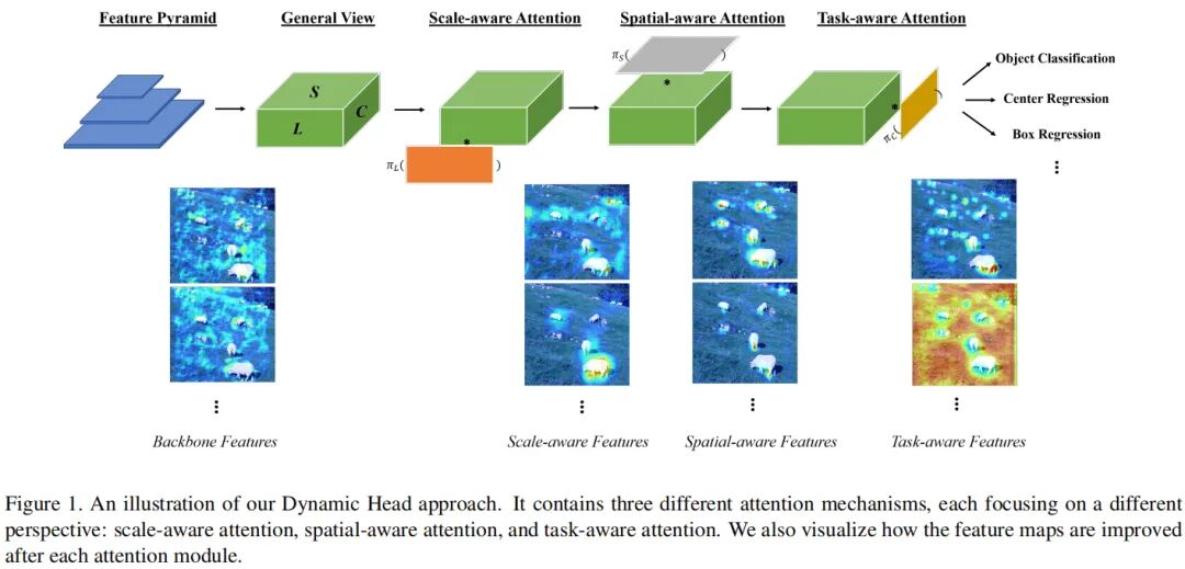 本文提出一种新颖的动态头框架,它采用注意力机制将不同的目标检测头进行统一。通过特征层次之间的注意力机制用于尺度感知,空间位置之间的注意力机制用于空间感知,输出通道内的注意力机制用于任务感知,该方法可以在不增加计算量的情况显著提升模型目标检测头的表达能力。