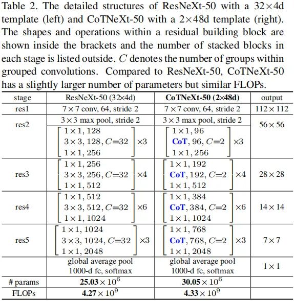 具体来说,CoTNet-50直接采用CoT替换Bottlenck中的 卷积;类似的,CoTNeXt-50采用CoT模块替换对应的组卷积,为获得相似计算量,对通道数、分组数进行了调整:CoTNeXt-50的参数量是ResNeXt-50的1.2倍,FLOPs则是1.01倍。