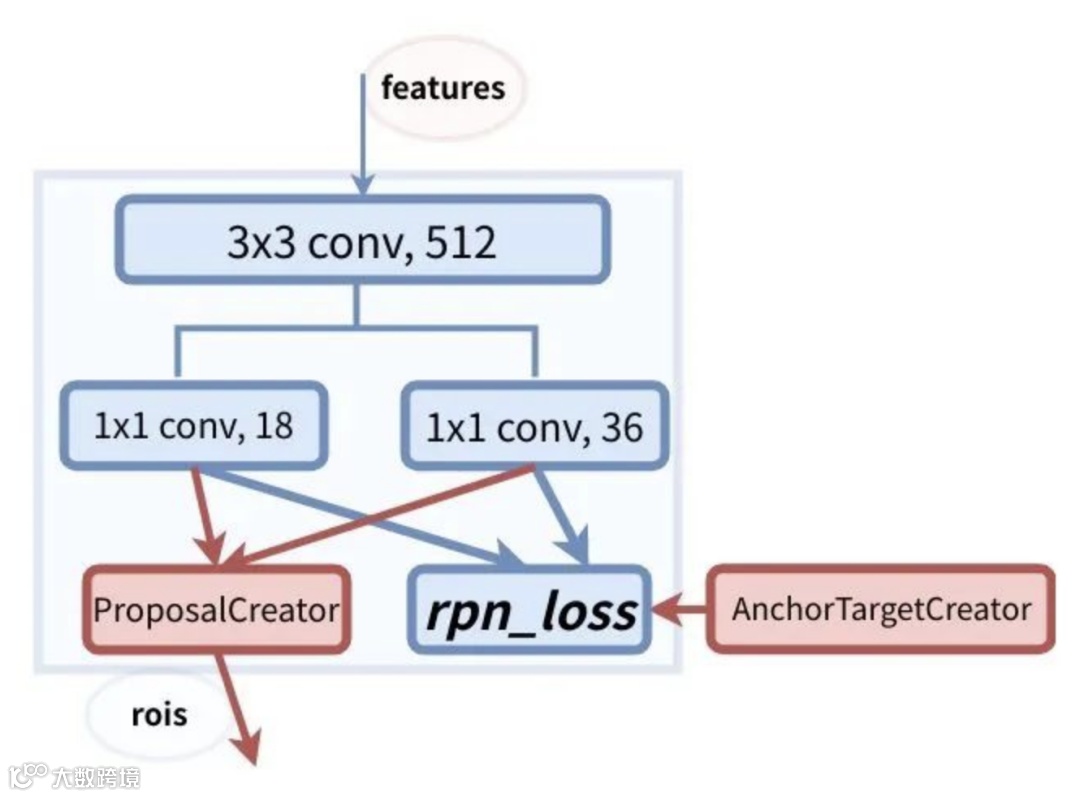 上图是RPN网络的具体结构。RPN网络分成2个分支,一个分支通过softmax分类得到所有anchors的分类分数,另一个分支用于计算所有anchors的边界框回归偏移量,以获得精确的proposal。最后在ProposalCreator通过分类分数和偏移量来得到合适的proposals。