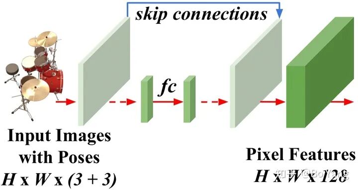 像素的通用特征提取模块如图3所示,我们设计的结构不是直接将原始的RGB图像输入到CNN网络中,而是将RGB值与图像当前位置的视角方向(即沿着相机光心到每个像素点的射线方向)堆叠后作为输入。这样做的目的是允许学习的像素特征可以明确地意识到它在3D空间中的相对位置。 除此之外,我们使用了Skip Connection 来保留每个像素的高频局部特征,同时在CNN模块的中间选择性地集成了几个全连接层来学习全局特征。这种多层级特征的混合使得最终结果更具有普遍性和代表性。