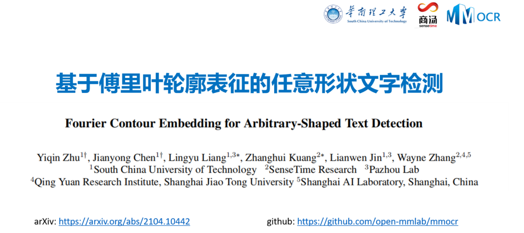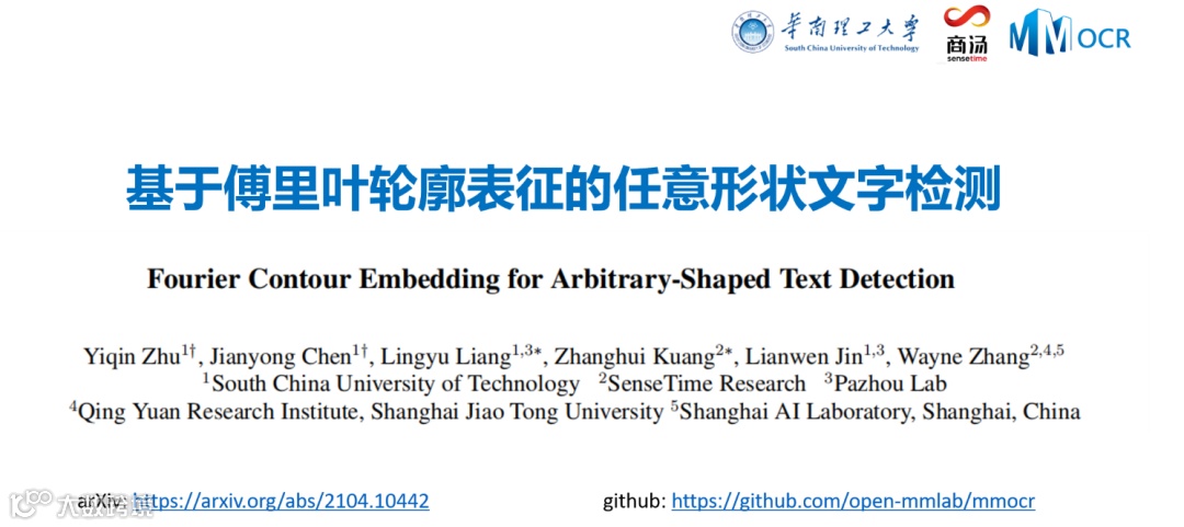 ”(CVPR2021录用论文题目:Fourier Contour Embedding for Arbitrary-Shaped Text Detection)的学术报告。任意形状的文本检测的主要挑战之一是如何设计一个好的文本实例表示形式,使网络可以学习各种文本几何形状的变化。大多数现有方法通过笛卡尔或极坐标系中的掩模或轮廓点序列在图像空间域中对文本实例进行建模。但是,基于掩模的表示可能需要导致复杂的聚合后处理,而点序列的表示可能对高度弯曲的文本表达不充分。为了解决这些问题,我们在傅立叶域中对文本实例进行建模,并提出了一种新颖的傅立叶轮廓表征(FCE)方法,以将任意形状的文本轮廓表示为紧凑的傅里叶系数序列。我们进一步构建具有主干,特征金字塔网络(FPN)以及具有反傅立叶变换(IFT)和非最大抑制(NMS)的简单后处理功能的FCENet。与以前的方法不同,FCENet首先预测文本实例的紧凑傅立叶系数,然后在测试过程中通过IFT和NMS重建文本轮廓。大量的实验表明,即使具有高度弯曲的形状,FCE仍能准确,鲁棒地适合场景文本的轮廓,并且还验证了FCENet对于任意形状的文本检测的有效性和良好的通用性。此外,实验结果表明,不仅在CTW1500和Total-Text上、并且在挑战高度弯曲的文本子集时,我们的FCENet优于最新的(SOTA)方法。