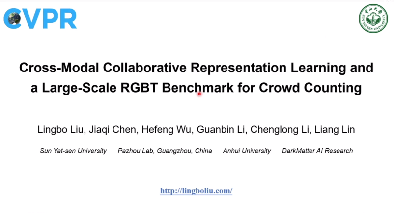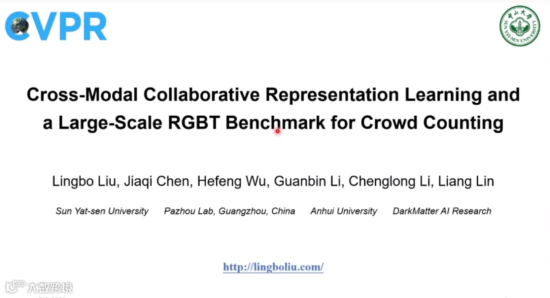 报告5:来自中山大学的刘凌波同学做了题为“面向RGBT人群计数的跨模态协同表征学习”(CVPR2021录用论文题目:Cross-Modal Collaborative Representation Learning and a Large-Scale RGBT Benchmark for Crowd Counting)的学术报告。人群计数是一项基本但又十分具有挑战性的视觉任务,它需要丰富的信息来生成像素级别的人群密度图。之前的方法大多数仅使有限的用光学图像信息,在不受控场景下无法很好地发掘潜在的行人。在这项工作中,作者们发现,融合光学信息和热感信息可以极大地提升人群计数性能。为了促进该领域未来的科学研究,我们首创地引入了一个大型RGBT人群计数(RGBT-CC)基准,该基准包含2,030对光学/热感图像,总共标注了138,389位行人。为了进一步促进多模式人群计数的研究,我们提出了一种跨模态协同表征学习框架,该框架由多个模态特异分支,一个模态共享分支以及一个信息聚合分散模块(IADM)组成,以充分捕捉不同模态数据的互补性。具体来说,我们的IADM由两个协同信息传递器组成,通过对偶信息传播机制动态地增强模态共享表征和模态特异分支表征。在RGBT-CC数据集上进行的大量实验充分地验证了我们框架对RGBT人群计数的有效性。此外,我们的方法在RGBD人群计数任务上也取得了业内领先的性能。