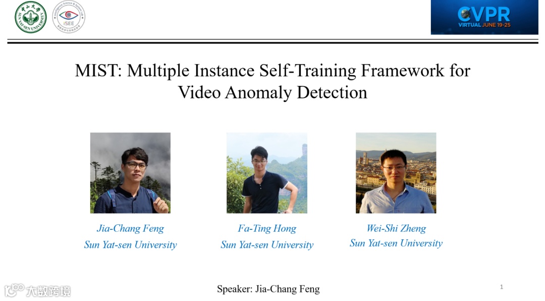 报告10:来自中山大学的冯嘉昌同学做了题为“面向视频异常检测的多示例自训练框架”(CVPR2021录用论文题目:MIST: Multiple Instance Self-Training Framework for Video Anomaly Detection)的学术报告。弱监督视频异常检测是一种基于可分特征将异常从正常事件中检测出来的任务。然而,大多数现有工作受限于不充分的特征表示。本工作中,作者们提出了多示例自训练的框架(MIST),该框架仅使用视频级别标签,高效地优化任务相关的特征表示。特别地,MIST包括了(1)一个多示例学习的伪类标生成器,它采用了稀疏连续采样策略来产生更加可信的伪类标;(2)一个自引导注意力模块增强的特征提取器,用以在特征提取过程中使提取器更关注异常区域。另外,该论文采用了自训练的方法来优化这两个部件,并最终得到一个任务特定的特征提取器。作者们在两个公开数据集上做了大量实验,这些实验结果证明了我们方法的有效性,而且本方法的性能与现有的有监督和弱监督方法相当甚至更好,特别是在ShanghaiTech数据集上,本方法获得了94.83%的帧级别AUC分数。