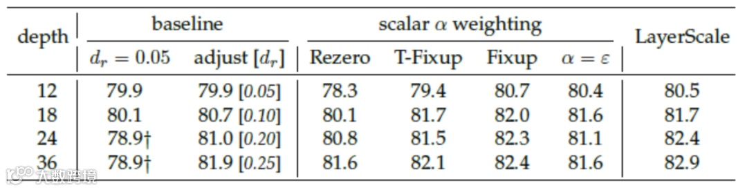 结果显示,Fixup 和 T-Fixup等技术在模型比较浅时与LayerScale效果相当,但是它们实现更复杂,因为需要为不同类型的layer设置不同的初始化方法。